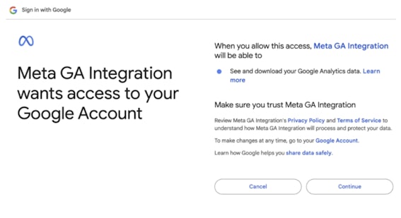 You’ll then be prompted to log in with your Google account—make sure you’re using the one connected to the GA4 property you want to integrate. You’ll briefly be redirected to Google for authentication. For the integration to work, your account must have Viewer access or higher for the GA4 property.