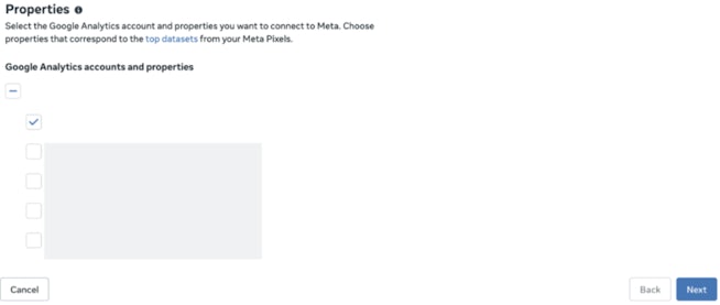 After authentication, you’ll be able to select which Google Analytics properties to link with Meta. Meta will suggest datasets (previously known as pixels) that are eligible for mapping, based on factors like recent ad spend. Hover over the options to see more details, and choose the datasets most relevant to your current or recent Meta campaigns.