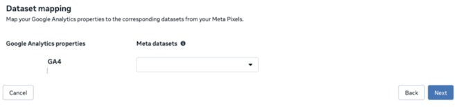 You’ll now be asked to match each GA4 property with its corresponding Meta dataset. Only datasets that your business owns or that have been shared with you will be available to map. It’s important to match the right ones, especially for advertisers managing multiple sites or brands.