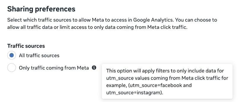 Next, you’ll choose what kind of GA4 traffic data Meta can access. You can either share all traffic sources (recommended for broader attribution) or only traffic coming from Meta. Be aware that if your GA4 property includes over 50 unique utm_source parameters from Meta ads, this filtered option may be disabled automatically.