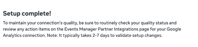 After submission, Meta will begin validating the integration. This can take between 2 to 7 days, though in some cases it may take up to 14 days. During this time, you’ll see a Pending status. Once the validation completes, revisit your GA4 integration in Events Manager and look in the top-right corner for the Connection Quality indicator. If everything is set up correctly, it should read High; otherwise, it may show as Low, prompting you to review and troubleshoot (which we’ll cover in the next section).