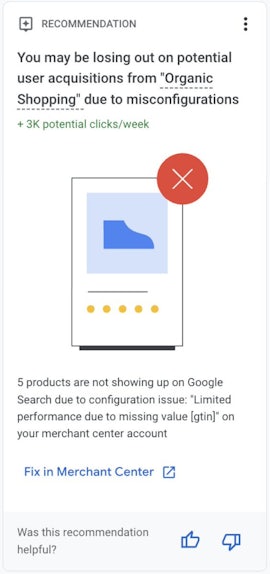 Google Analytics has integrated Merchant Center recommendations directly into its Recommendations section. According to Google, these insights will “alert you to issues preventing your products from being approved in Google Merchant Center.”