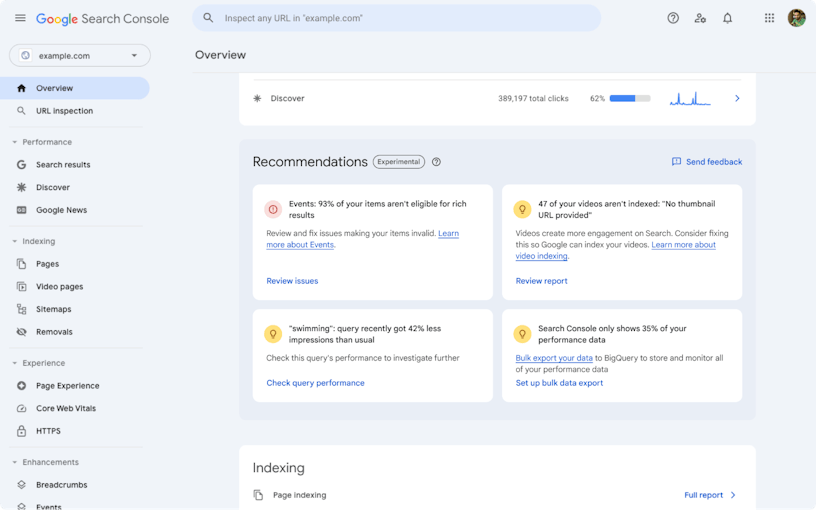 If opportunities have been identified on your website, they will be available in the Overview section of the Search Console dashboard. However, Google will only provide recommendations when there is an actionable opportunity.