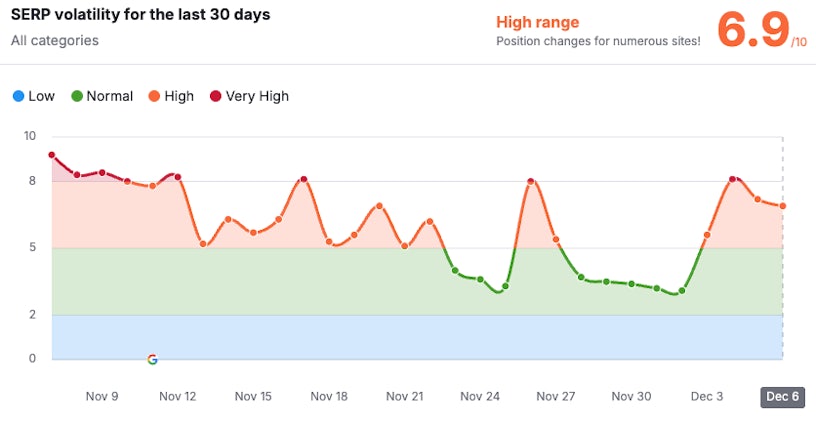 Since the last core update in August, SERP volatility has been notable. Before the November update, volatility levels were relatively low and stable, despite a brief spike earlier in the month.