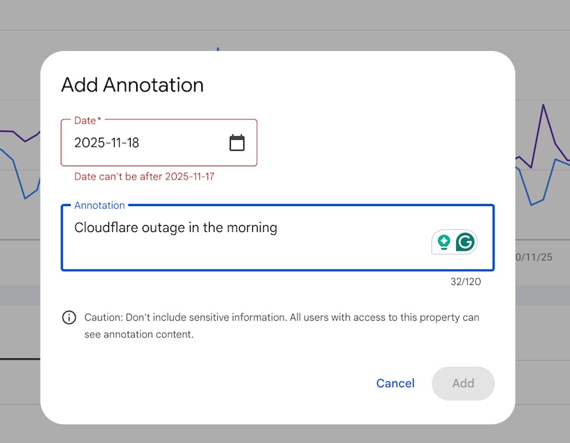 Google has updated the custom annotations feature in Google Search Console (GSC) to allow users to add notes not only for past dates but also for the current date or future dates. Previously, this wasn’t possible: for example, when a user was trying to annotate the day of a major outage (a Cloudflare issue), Google’s interface rejected the date because it was after the last available data date. On 19 November 2025, that restriction was lifted. Now you can schedule annotations even before any data is displayed.