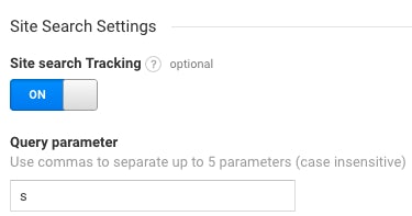 Once again, this feature requires manual configuration. Simply visit the view settings, turn Site Search “ON” and enter the word or words that designate internal query parameters in the “query parameter” field.