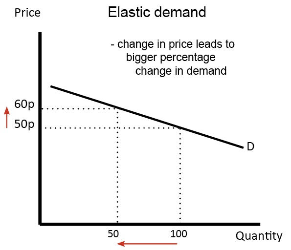 In the elastic demand curve below, the price has increased by 20% which has caused a large drop of 50% in demand.