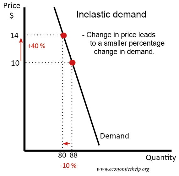 The inelastic demand curve below shows that a 40% increase in price only leads to a 10% decrease in demand.