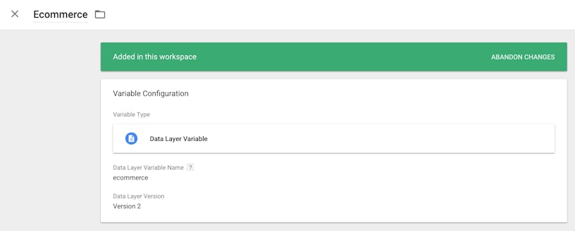The first variable should be called Ecommerce (variable names must match the names in {{handlebars}} in my example code below) and is of the type “Data Layer Variable”. The “Data Layer Variable Name” should be ecommerce (in lower case), all as below: