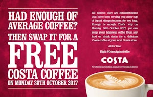 Questions were proposed as to the logic of this campaign, since free coffee receivers were sent on their way with fresh costa coffee in a rival branded cup. Perhaps the smaller details of the campaign needed work, but we still applaud Costa for their effort to convert rival coffee drinkers.