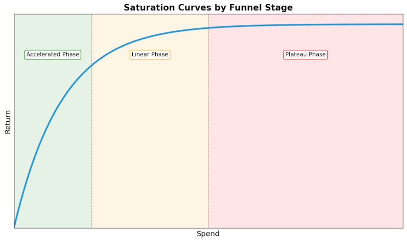 MMM quantifies the exact relationship between spend and return for each channel, showing you precisely where the accelerated phase ends and the plateau begins.