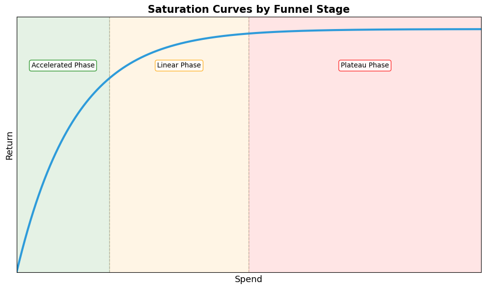 MMM quantifies the exact relationship between spend and return for each channel, showing you precisely where the accelerated phase ends and the plateau begins.