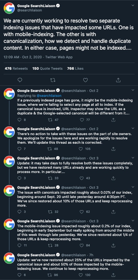 During the same time as the Search algorithm update, Google confirmed that there were two indexing issues that had impacted a few URLs (0.22% of their index). The two issues, outlined below, meant that some pages were not indexed for a period of time and were not appearing in Google’s search results. Or if they were appearing, a completely wrong URL was being shown in the search results for a certain query.