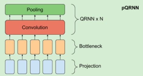 The PRADO model architecture has the potential to learn clusters of text segments from specific words as opposed to word pieces of characters. The pQRnn PRADO extension includes; a projection operation with the encoders fast processing, a dense bottleneck layer learns and attempts to understand every single word representation relevant to NLP tasks and a stack of QRNN encoders to learn contextual representation from the input of the text without employing the processing. A visualisation can be seen below.
