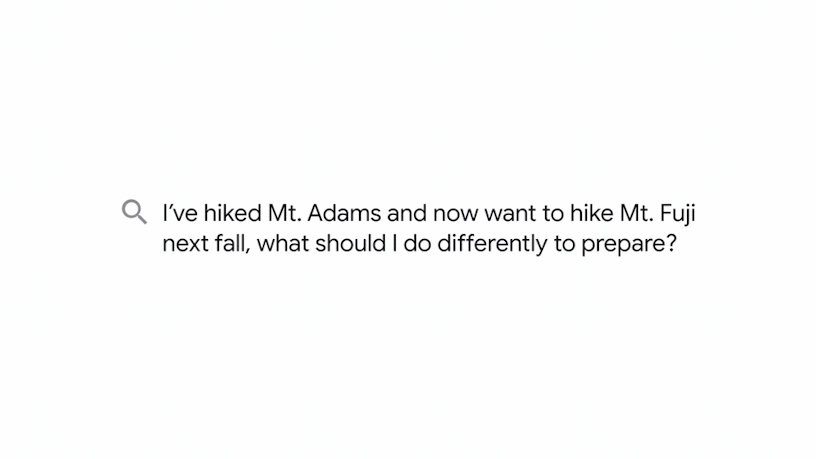The example given at the time was a user taking a picture of a pair of hiking boots and asking “can I use these to hike Mt. Fuji?” MUM would understand the image and advise you that the boots would be fine for hiking in those conditions, as well as pointing you in the direction of a blog with a list of recommended gear.