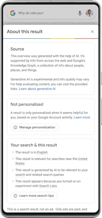 As part of these changes, Google is launching the ‘about this result’ feature for SGE. This tool provides users with context about how SGE create the response, allowing users to better understand the technology. Google plans to expand this feature to include individual links within SGE responses to provide users with information about the web pages that have helped to create the AI-generated content.