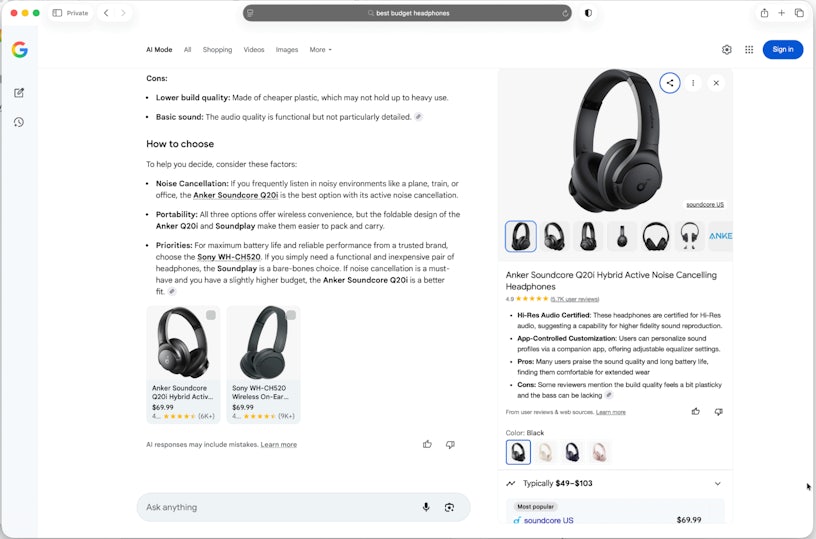 When you search for a product-related query in AI Mode, then scroll to the products and click on one, it will open a panel on the right-hand side. In the test version of this panel, you will see Google start to dynamically generate an AI summary of that product, and then it will load.