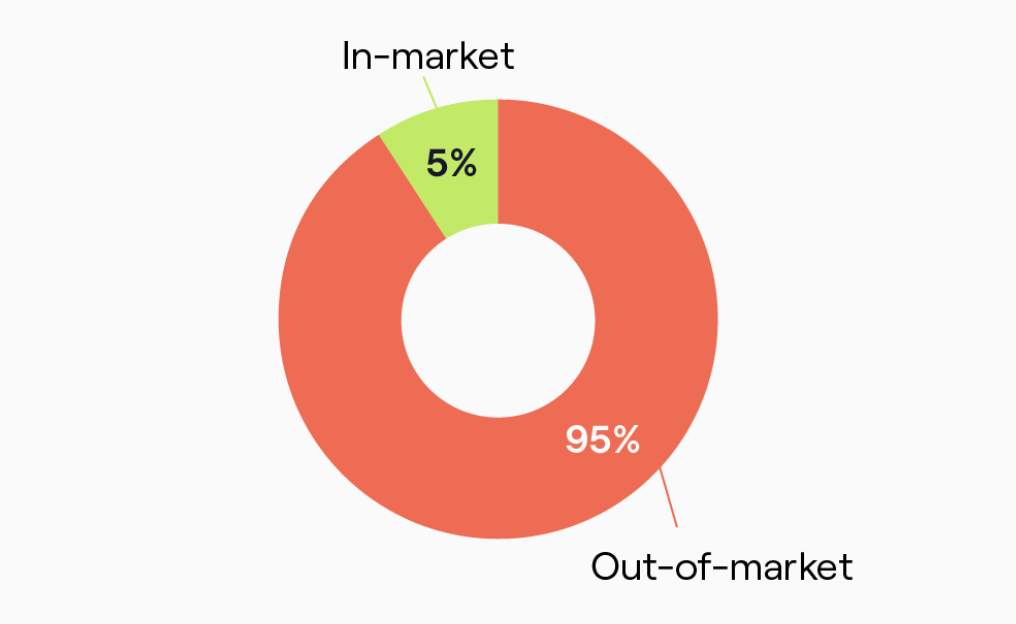 Sales-driving (‘performance’) activity is triggered by demand, for example, a user searching for a product and being served a PPC ad within their search results. But the volume of users who comprise this group is finite, potentially only 5% of the total volume of users who could be in-market for your product or service. Without tactics to increase the volume of your target audience, you will quickly reach your performance ceiling: when there are simply no more in-market users to convert. This is characterised by inflating CPAs and declining ROAS.