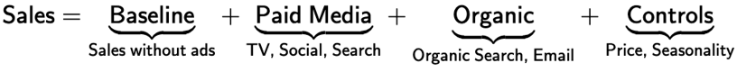 Firstly, a quick recap on MMM. Marketing Mix Modelling is a statistical technique that measures the impact of marketing activities. Simply put, the equation looks like this: