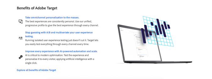 Adobe Target is ideal for enterprise-level businesses and CROs that have vast experience with Adobe’s suite of products. Much like Google Optimize, it’s not particularly flashy and may take some time to get used to. The key points that Adobe Target sells itself on are omnichannel personalisation and AI-personalisation, which are extremely important in today’s marketing world from both a user experience and data-science perspective.