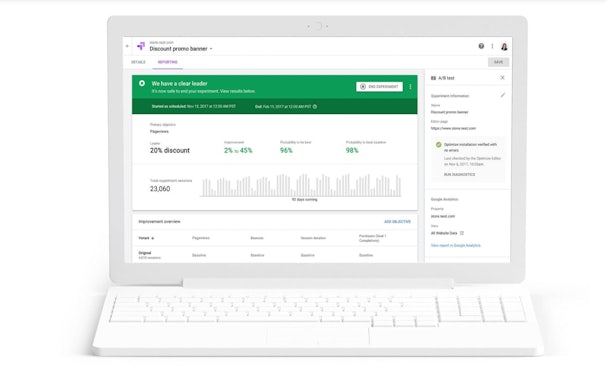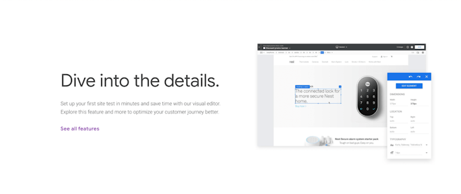 It includes most things you would expect from A/B testing tools such as variant & control, split and multivariate tests. As well as personalisation, a visual editor, user attributes and reporting dashboard. But most importantly, it’s completely free! For those looking for more advanced options, there is an Optimize 360 version of this software as a part of the full 360 suite.