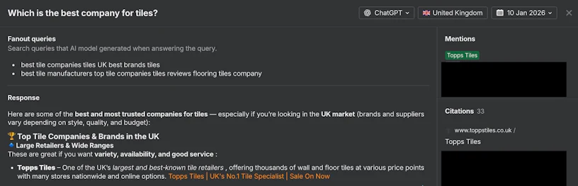 | Our smaller competitors are being mentioned above us, even though we rank higher | ‘AI mentions’ metrics for small competitors are higher | We have a “Third-Party Validation” gap. Potential customers will think our competitors are better | “AI models prefer third-party verification.* We need to prioritise third-party validation through marketing and incentivising customers through satisfaction and reviews” |