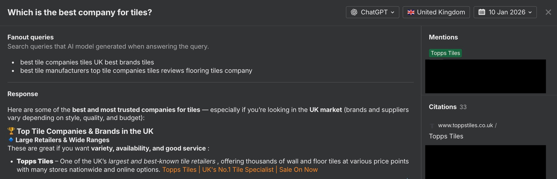 | Our smaller competitors are being mentioned above us, even though we rank higher | ‘AI mentions’ metrics for small competitors are higher | We have a “Third-Party Validation” gap. Potential customers will think our competitors are better | “AI models prefer third-party verification.* We need to prioritise third-party validation through marketing and incentivising customers through satisfaction and reviews” |
