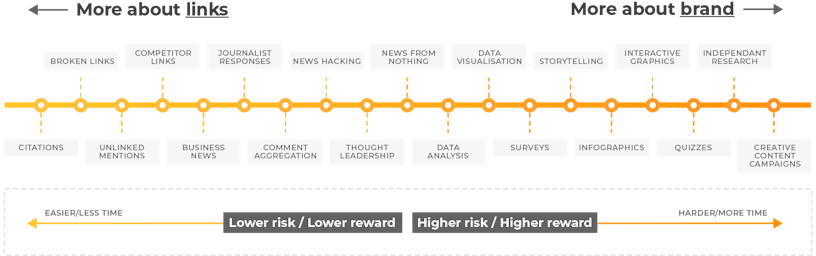 We believe that there is a whole host of different formats which make up the link building spectrum. We tried to define this in this graphic below, but of course we’re overtly aware that there are new formats developed all the time. It’s never set in stone.