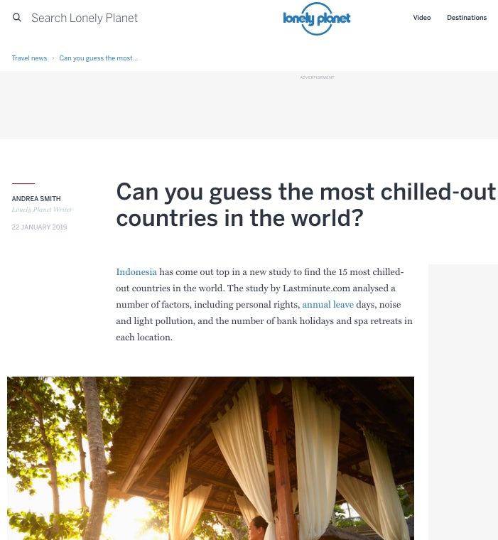 Katheryn Watson, Digital PR Manager at Kaizen spoke to me about a campaign called ‘The World’s Most Chilled Out Countries’, which was their first campaign at Kaizen for Lastminute.com. I expect the pressure was on then, and they certainly delivered. No surprise that this campaign already sits on our digital PR inspiration pinterest board.