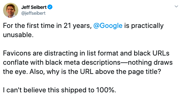 Jeff is not alone in his opinion. Many are calling the new layout “cluttered”. According to Google, the change was meant to help put branding “front and center,” and also “[help] you better understand where the information is coming from and what pages have what you’re looking for.” Unfortunately, users aren’t finding it easier to navigate the SERPs.