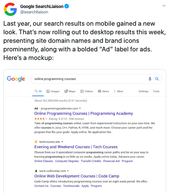 New year, new SERPs. Google has changed the look of the desktop search engine results to include favicons and newly designed ad listings. The URL of each result now sits above the page title, with the link changed to black text.