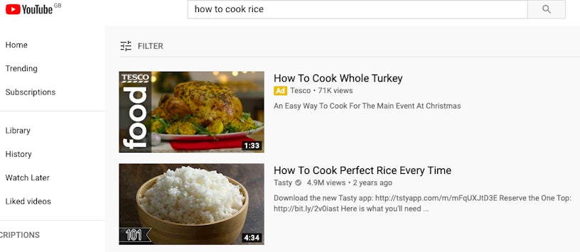 TrueView discovery – Similarly to TrueView in-stream, TrueView discovery ads are bought on CPV and can run on both desktop and mobile devices. They can appear as a promoted video on YouTube home feed, watch feed or search results and their aim is to reach an audience of people in key moments while they’re researching or watching videos on YouTube. The marketing objective of both TrueView discovery & TrueView in-stream is the same – to drive consideration, however, with TrueView discovery ads, users have to click on the ad to watch it rather than having a choice of skipping it after the first 5 seconds. Overall, TrueView discovery ads are great for capitalising on key moments of discovery.