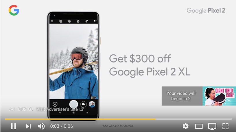 If your goal from YouTube ad is the view counts, Google recommends to create a video that’s at least 12 seconds long but not longer than 3 minutes.TrueView for action ad example