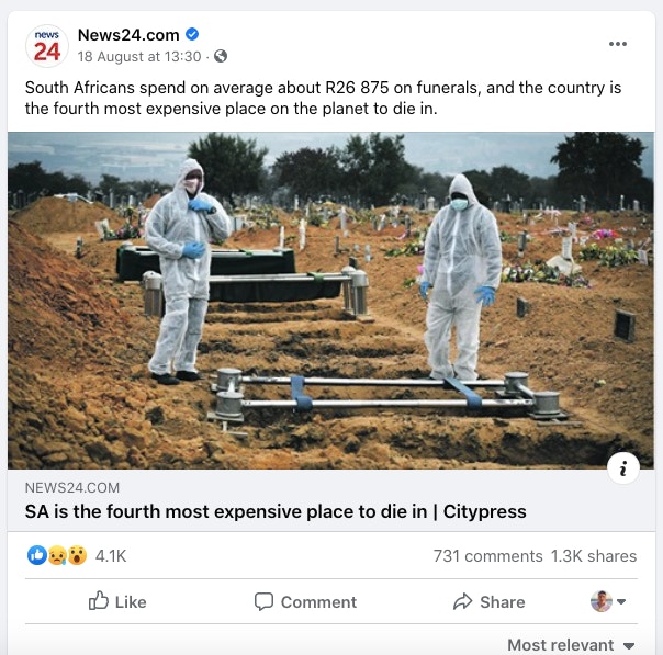 Earlier this month my colleague James’ campaign on the ‘Cost of Dying’ really took off on News24’s Facebook page receiving more than 1,000 shares and 700 comments – something the journalists there would’ve been delighted with.
