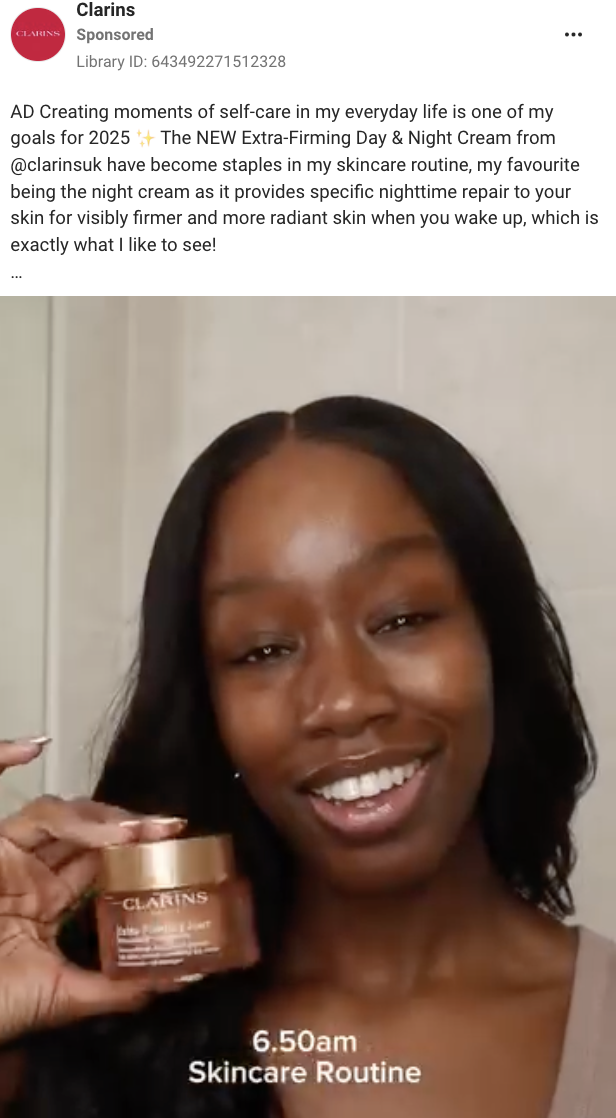 By utilising Lo-Fi creator content in its ads on TikTok and Instagram, Clarins showcases the authentic benefits of its products in action. The ads feature relatable, everyday scenarios, fostering a sense of connection with the audience through imperfection and relatability.