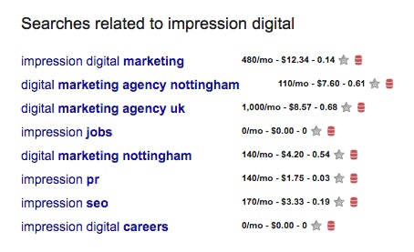 There are a couple of other less quantifiable metrics, that also show the strength of brand, such as the brands we come up against – it’s very rare these days that we come up against smaller local agencies in pitches, and far more common to be pitching against well known, well established, massive players on our field. We can also look at what Google suggests as alternatives to searches for “impression digital” and see how well it now understands our brand and sees its semantic relevance to other key terms: