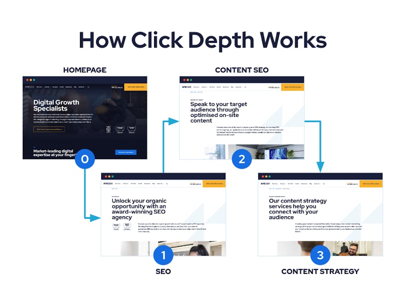 The structure of your site creates a hierarchy: more important pages appear higher up in the architecture, with your homepage right at the top. As you progress deeper into a website via links, the position of each page can be measured in terms of click depth; that is, the number of clicks required to reach a URL from the homepage, or primary entry point.