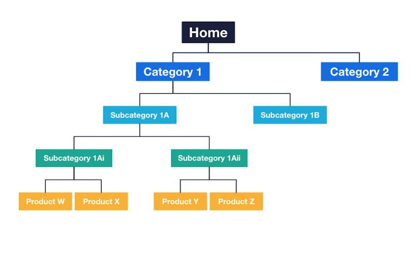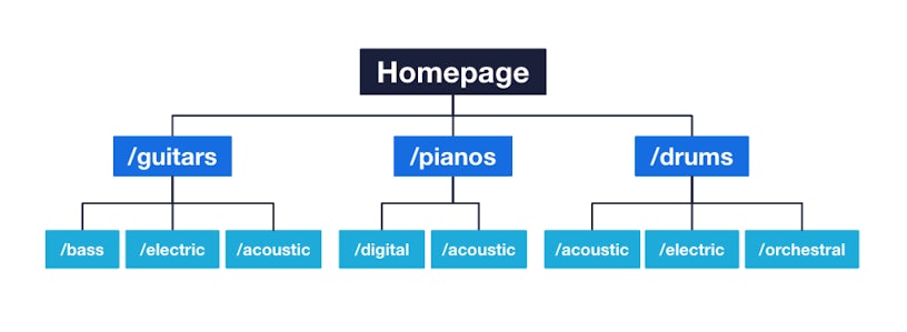 Websites that naturally rely on categorisation and subcategorisation such as ecommerce websites benefit from hierarchical structures. Take, for example, a musical instrument retailer that has high-level product categories (e.g. guitars) flowing into smaller and more specific subcategories (e.g. bass guitars, electric guitars, acoustic guitars).