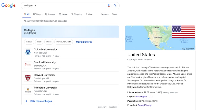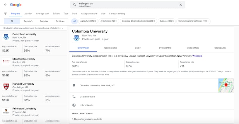 The platform, which was rolled out in the US and India at the end of last year, allows users to research and compare different colleges against each other in one place. The platform includes a wealth of data that users can use to filter the results of their searches, including:
