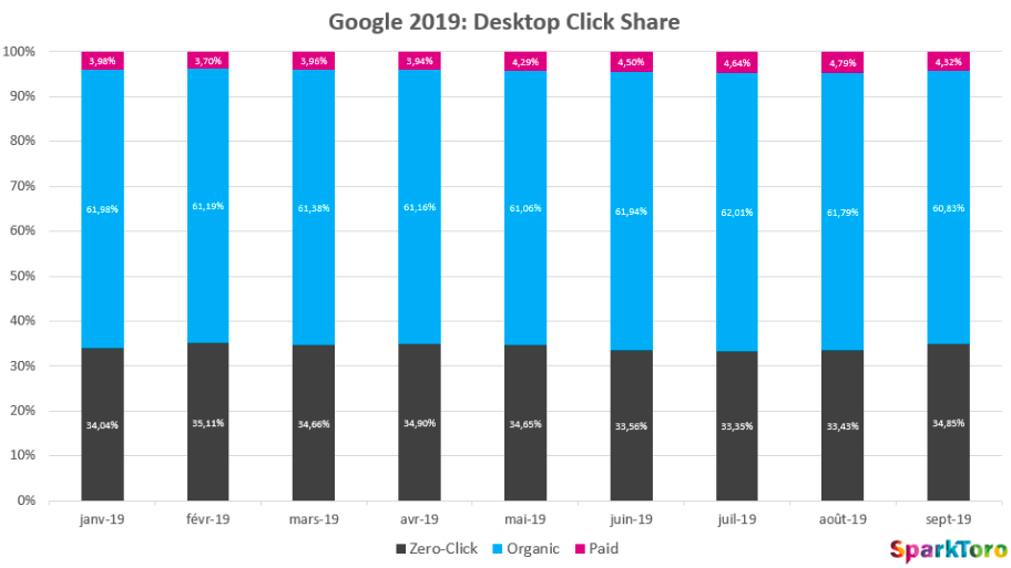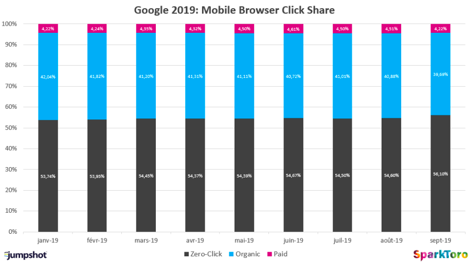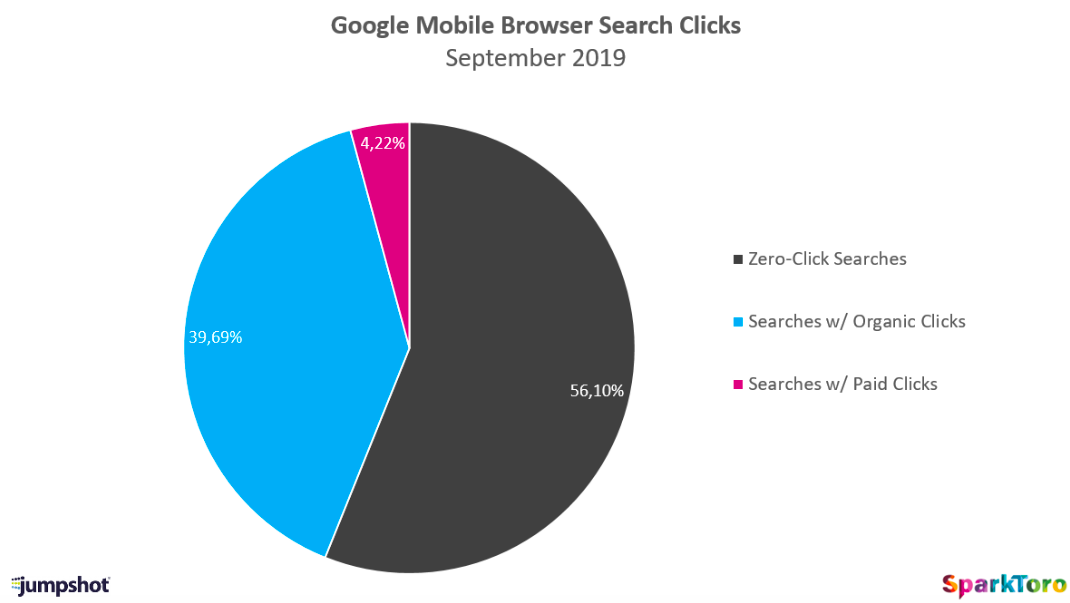 This graph is indicative of the wider SEO trend of no-click searches. By introducing SERP features, Google is taking the search experience increasingly into its own hands by keeping users in its search results, ready to click on ads and on Google properties. In September 2019, around 56% of global mobile searches resulted in zero-clicks.