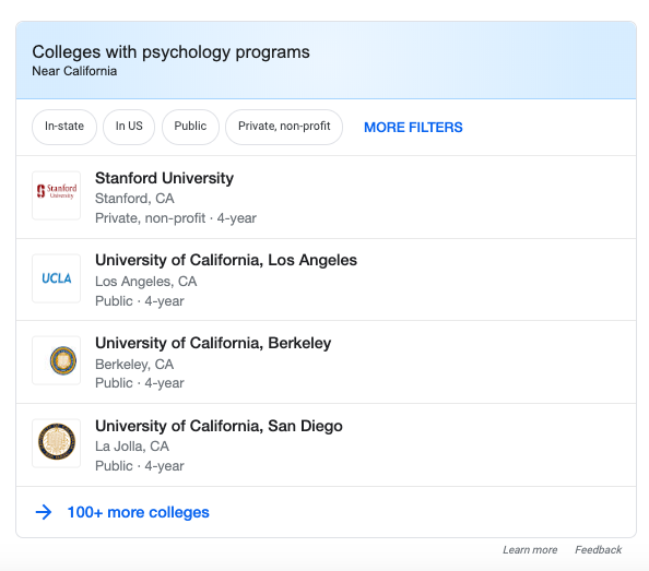 The platform only currently operates at a general university level, but it’s more than likely that we could see it expanding to individual courses into the near future. Google already has ‘Course’ schema markup, and when Google has a type of schema it’s more than likely that it’ll eventually be rolled into a SERP feature. Google’s own schema markup reference pages are a good indicator of future SERP features as we’ve seen from the past; Jobs for example.
