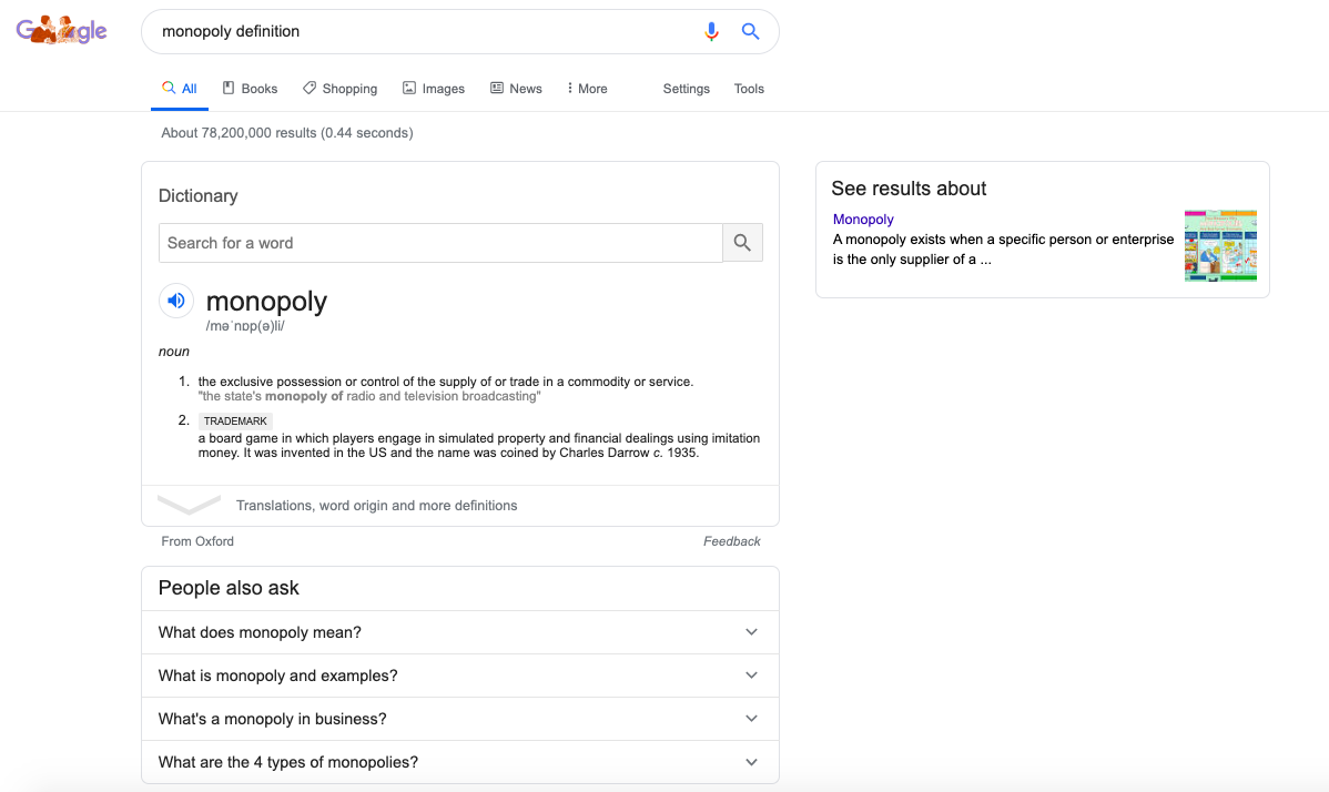 Rand Fishkin shared data from now-closed marketing analytics company Jumpshot in November 2019, in which he mentions the impact that SERP features have on organic traffic opportunity. In one example, he explains that SERPs lost 30%-70% of available clicks when definition boxes were expanded (see example SERP for ‘monopoly definition’).