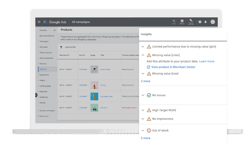 Product-specific insights are another valuable tool in the Google Ads products tab that will help advertisers identify underperforming offers and products with missing feed attributes in order to deliver comparable bidding strategies against competitors.