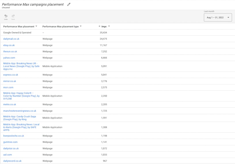 Now marketers have a bit more insight into their Performance Max campaign and can differentiate between how much of their impressions come from placements compared to search or display impressions. Moreover, they can see where their ads showed most often and plan their marketing decisions accordingly. For instance, seeing the webpage or mobile app where their ads appeared more, marketers could choose to target audiences most interested in those placements.
