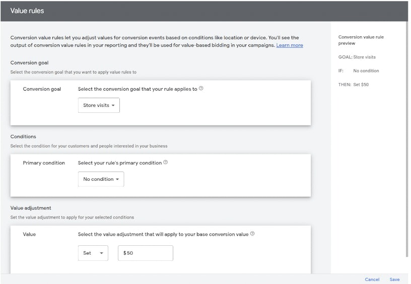 Furthermore, this new feature allows marketers to select conditions to their rules such as geographic location, audiences and devices, which enables further customisation of the conversion goals. For instance, if a business considers shop visits from mobile devices to have a higher importance, it could create a rule to multiply shop visit value by a certain amount specifically for users coming from mobile devices.