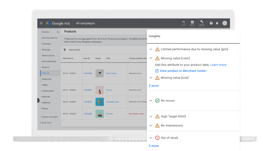 Product-specific insights are another valuable tool in the Google Ads products tab that will help advertisers identify underperforming offers and products with missing feed attributes in order to deliver comparable bidding strategies against competitors.