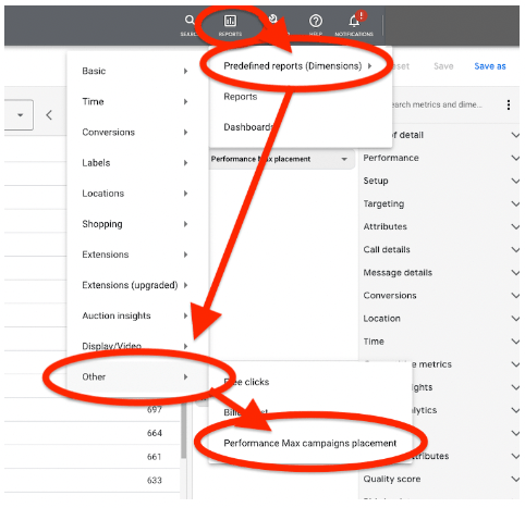 Placements Reports for Performance Max can easily be found under Predefined reports in Google Ads, as shown below. Here, marketers can find all of the websites and mobile applications ads appeared on, as well as seeing the number of impressions for the dates you select. Besides seeing a predefined report, Google also allows marketers to create a custom report for placements, by using the attribute “Performance Max placement” in the Reports tab.