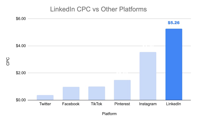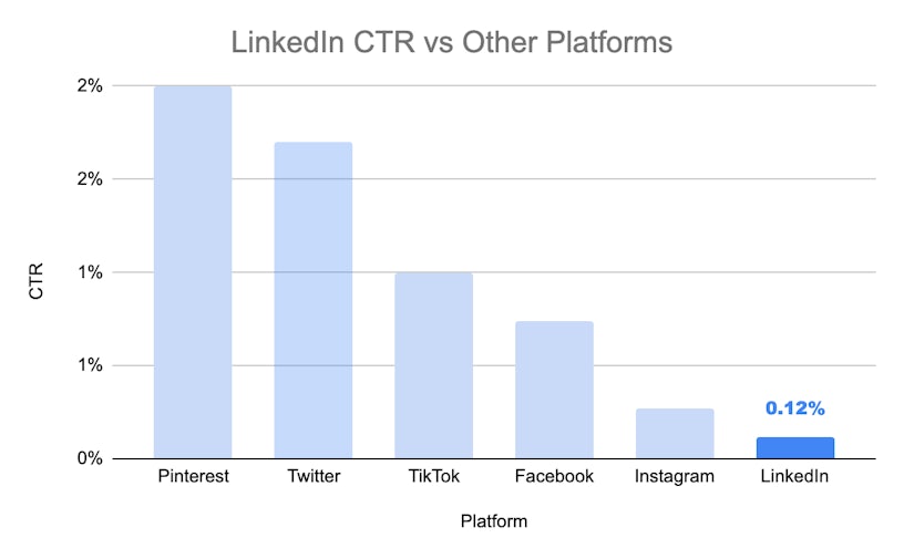 LinkedIn is typically more expensive in terms of CPC versus other platforms. This is despite having one of the cheaper CPMs, the reason for the expensive CPC can be attributed to the CTR which tends to be much lower.