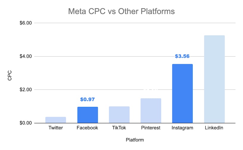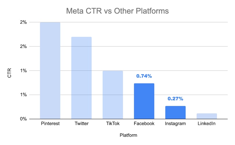 In terms of key metrics, Meta’s platforms tend to differ. Whilst Facebook and Instagram usually have similar CPMs, Facebook typically produces cheaper traffic thanks to its stronger CTR than Instagram. This difference has led to Facebook being one of the more efficient platforms for driving traffic.