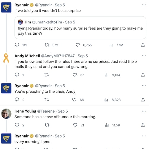 Twitter encourages direct interactions and conversations between users. Ryanair is a classic example of this both through organic and paid content;